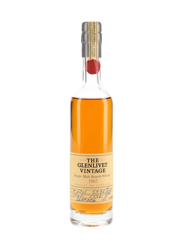 A 20cl bottle of The Glenlivet 1967 Single Malt Scotch Whisky, originally released as part of The Glenlivet Vintage Collection which contained four other vintage expressions. This was bottled in 1998 at 53.32% ABV.