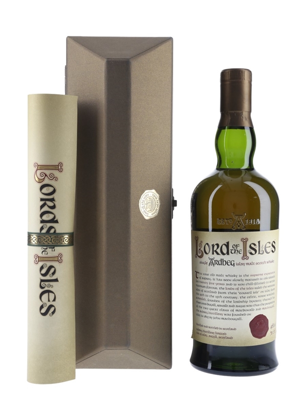 A bottle of Ardbeg Lord of the Isles Single Islay Malt Scotch Whisky, matured for 25 years. It was first launched in 2001 and production continued until 2007. This is presented with a scroll telling the story of Somerled, a Celtic-Norse warlord and the first Lord of the Isles.