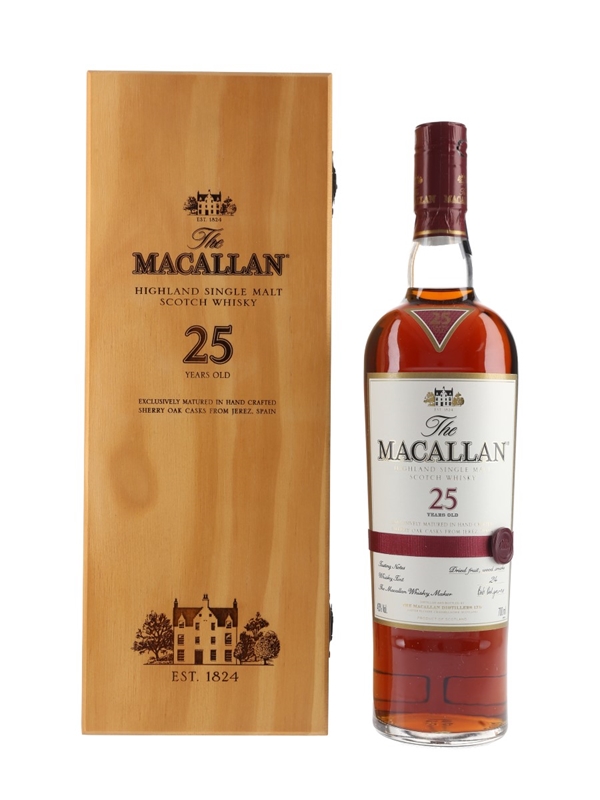 A bottle of The Macallan 25 Year Old Highland Single Malt Scotch Whisky, exclusively matured in hand crafted sherry oak casks from Jerez, Spain.