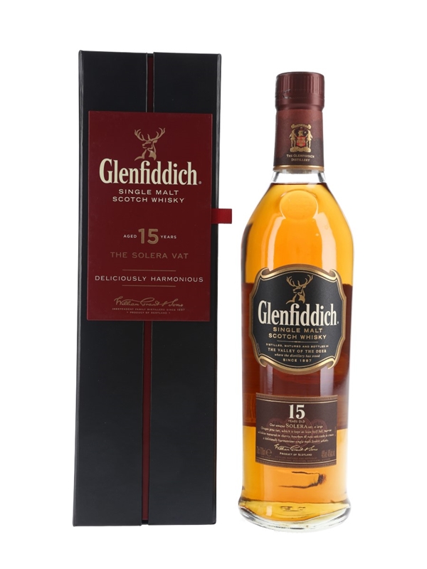 A bottle of Glenfiddich 15 Year Old Solera Vat Single Malt Scotch Whisky. This expression was matured in sherry, bourbon and new oak casks before bottling.