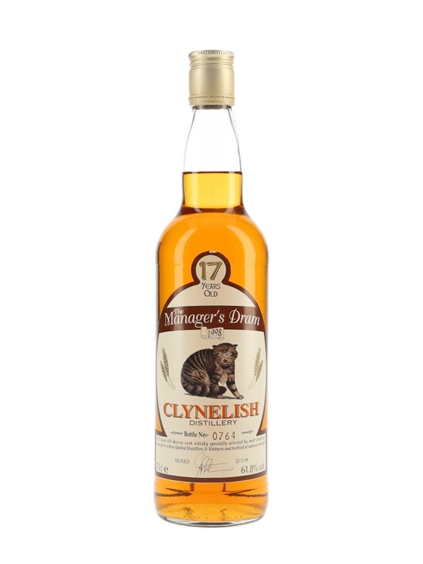 A bottle of Clynelish 17 Year Old The Manager's Dram Single Malt Scotch Whisky. This was matured in sherry casks, specially selected by malt distillery managers within United Distillers & Vintners and bottled at a natural cask strength of 61.8% ABV on 23 November 1998.