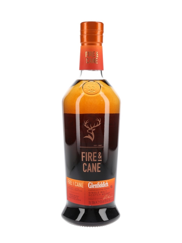 A bottle of Glenfiddich Fire & Cane Single Malt Scotch Whisky, a smoky whisky finished in sweet rum casks. This is the fourth release in the distillery's Experimental series.