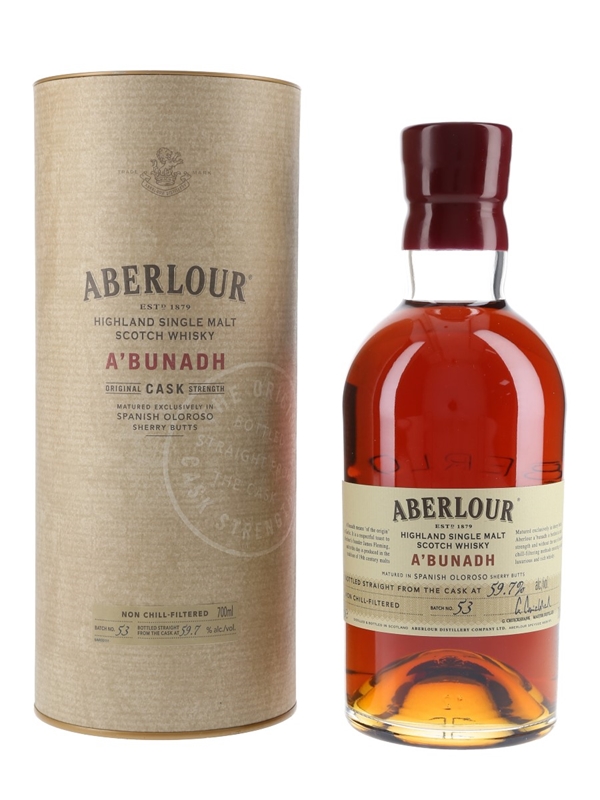 A bottle of Aberlour A'bunadh Batch 53 Highland Single Malt Scotch Whisky, matured in Spanish oloroso sherry butts and bottled at 59.7% ABV.