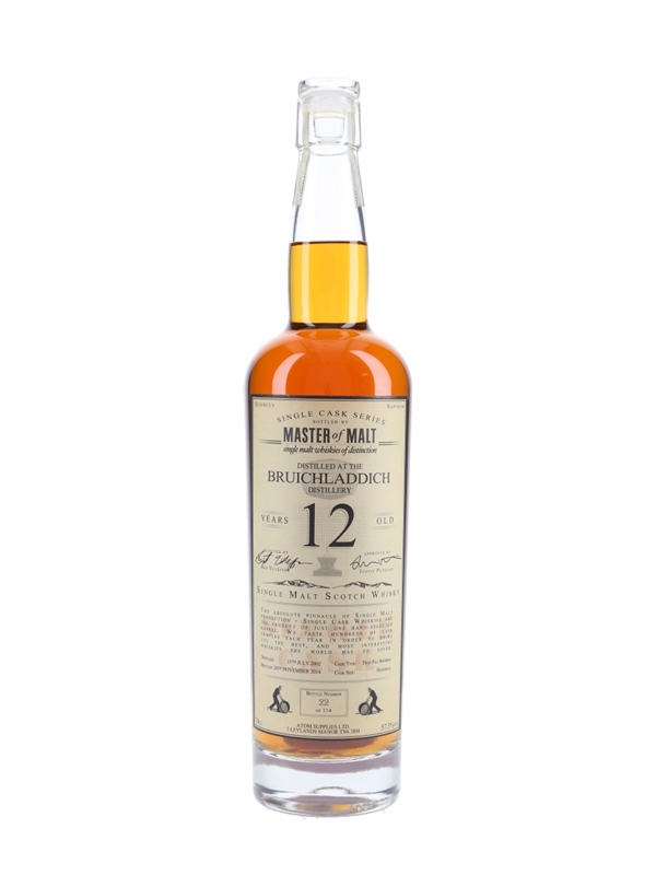 A bottle of Bruichladdich 12 Year Old Single Malt Scotch Whisky. This was distilled on 15 July 2002, matured in a first fill bourbon hogshead and bottled on 26 November 2014 by Master of Malt as part of their Single Cask series.