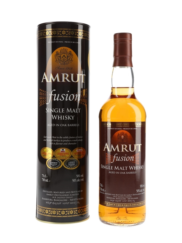 A bottle of Amrut Fusion Single Malt Whisky, made from a combination of Scottish and Indian barley. The bottling code indicates this was bottled in June 2015.