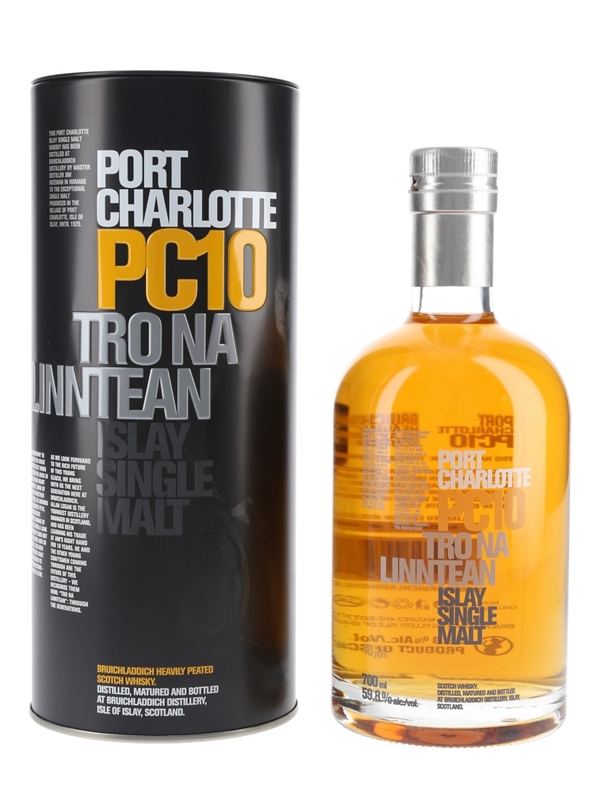 A bottle of Port Charlotte PC10 Tro Na Linntean Islay Single Malt Scotch Whisky.