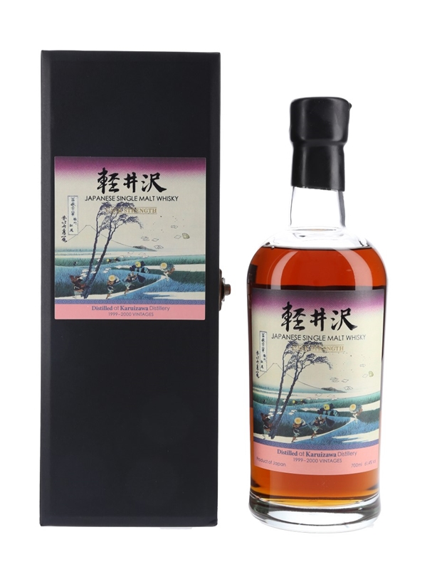 A bottle of Karuizawa Cask Strength Japanese Whisky from the 36 Views of Mount Fuji series. Each bottle in this series was produced from Karuizawa's final two vintages, 1999 and 2000, and are bottled at cask strength. The labels feature artwork by Japanese ukiyo-e artist Hokusai, depicting Mount Fuji from different aspects.