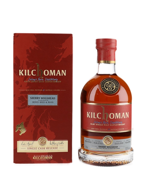 A limited edition bottle of Kilchoman 2012 IslaySingle Malt Scotch Whisky. This was distilled on 23 August 2012, matured in a single sherry hogshead and exclusively bottled on 13 December 2019 for Berry Bros & Rudd.