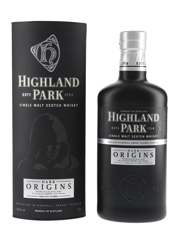 A bottle of Highland Park Dark Origins Single Malt Scotch Whisky, a sherried expression which was matured in 80% first-fill sherry casks and 20% refill casks.