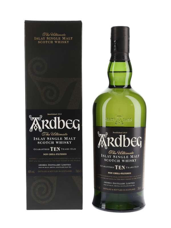 A bottle of Ardbeg 10 Year Old The Ultimate Single Islay Malt Scotch Whisky. The bottling code indicates this was bottled in 2014.
