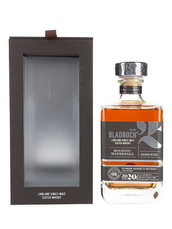 A bottle of Bladnoch Lowland Single Malt Scotch Whisky. This was matured in oloroso sherry and bourbon casks and bottled as part of the Master Distiller's Waterfall Collection.