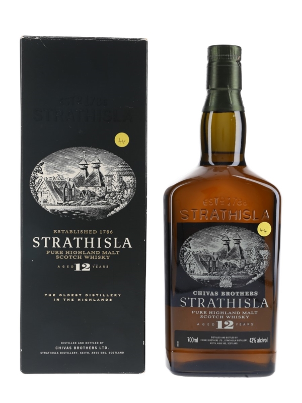 A bottle of Strathisla 12 Year Old Pure Highland Malt Scotch Whisky, produced by Chivas Brothers. This bottle has a screen printed label depicting the distillery.