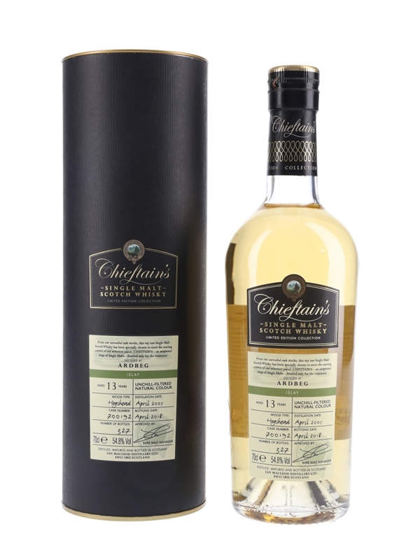 A bottle of Ardbeg 13 Year Old Single Malt Scotch Whisky. This was distilled in April 2005, matured in a single hogshead and bottled in April 2018 by Ian Macleod for the Chieftain's Choice series.