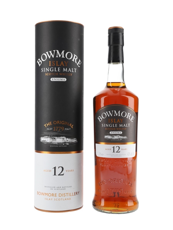A litre bottle of Bowmore 12 Year Old Enigma Single Malt Scotch Whisky, originally released for travel retail.