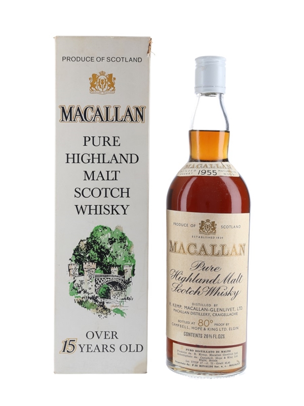 A bottle of The Macallan 1955 Pure Highland Malt Scotch Whisky, matured in sherry casks and bottled by Campbell, Hope and King. This was imported to Italy by Rinaldi, we estimate in the 1970s.