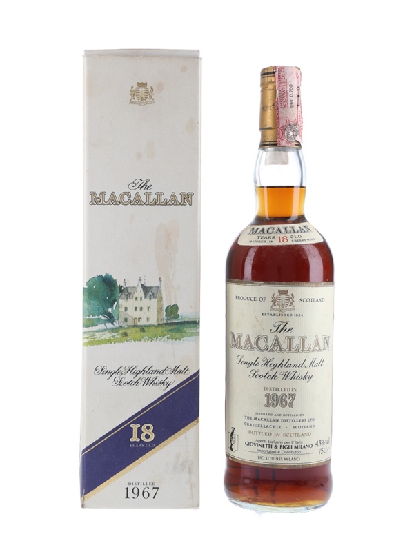 A bottle of The Macallan 18 Year Old Single Highland Malt Scotch Whisky, distilled in 1967 and matured in sherry casks. This was imported to Italy by Giovinetti, we estimate in the 1980s.