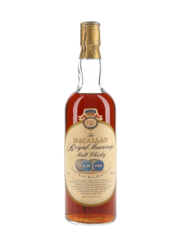A bottle of The Macallan Royal Marriage Malt Whisky, released in 1981 to commemorate the marriage of Prince Charles and Lady Diana Spencer.