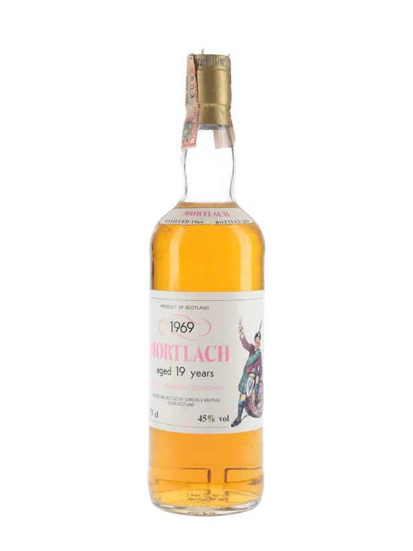A bottle of Mortlach 19 Year Old Finest Old Highland Malt Scotch Whisky. This was distilled on 7 September 1969 and bottled by Gordon & MacPhail in July 1989. This was imported to Italy by Intertrade, Rimini.