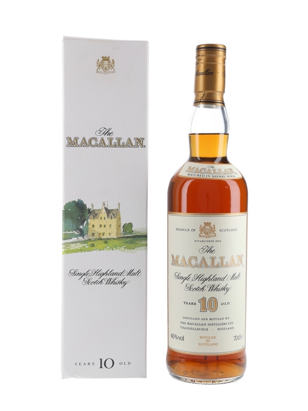 A bottle of The Macallan 10 Year Old Single Highland Malt Scotch Whisky, matured in sherry wood. We estimate this was bottled in the 1990s.