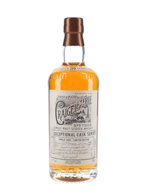 A bottle of Craigellachie 39 Year Old Single Malt Scotch Whisky. This was distilled on 19 March 1980, matured in a refill hogshead and bottled as part of the Exceptional Cask series.