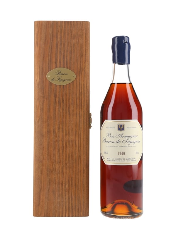 A bottle of Baron de Sigognac 1940 Bas Armagnac, matured in oak casks and bottled on 11 January 2005. This comes in a wooden presentation box.