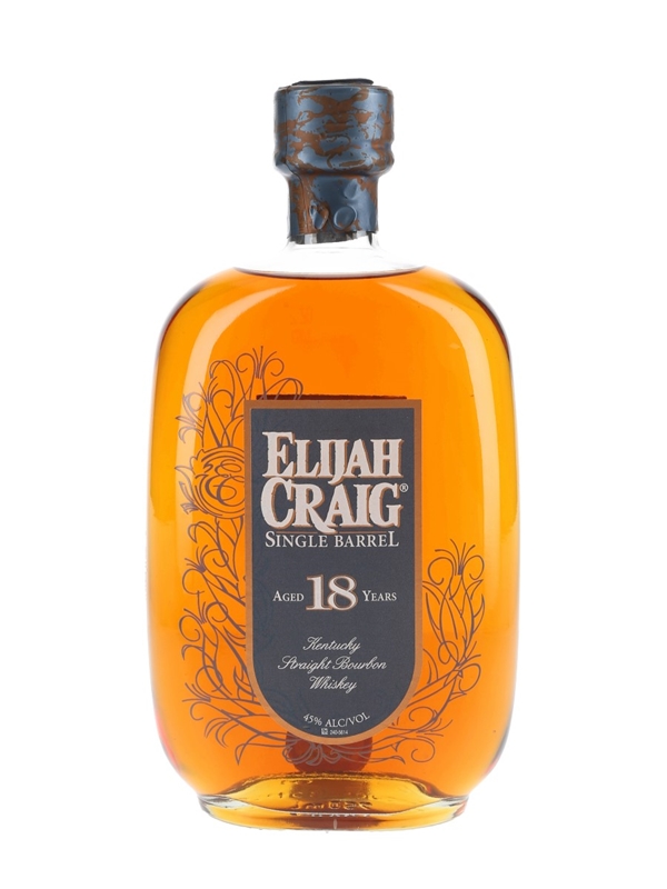 A bottle of Elijah Craig 18 Year Old Kentucky Straight Bourbon Whiskey, barreled on 25 July 1997, matured in single barrel and bottled by The Elijah Craig Distillery Co., Kentucky in the 2000s.