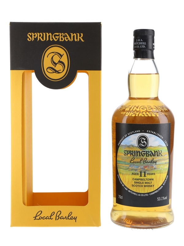 A bottle of Springbank 11 Year Old Local Barley Campbeltown Single Malt Scotch Whisky. This was distilled in February 2006 from Bere barley grown on Aros Farm, matured for 11 years and bottled in February 2017.