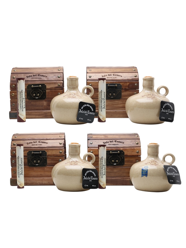 This case contains four ceramic jugs of Isla del Tesoro Extra Añejo rum from Santiago de Cuba. Isla del Tesoro Extra Añejo is a blended rum aged for a minimum of 20 years, and each jug is presented in a wooden treasure chest and a hessian bag.