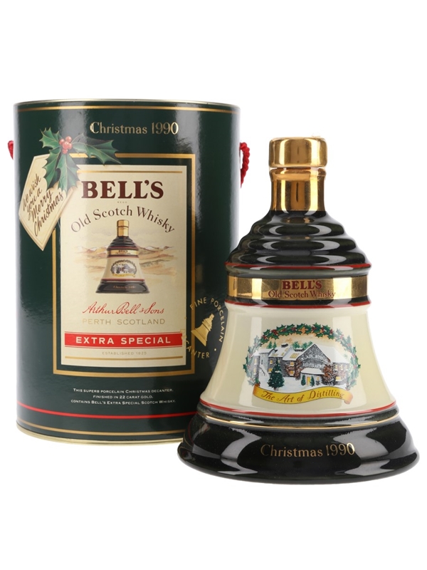 A bottle of Bell's Old Scotch Whisky presented in a ceramic decanter and released for Christmas 1990. The label depicts 'The Art of Distilling' with Blair Athol distillery blanketed in snow.