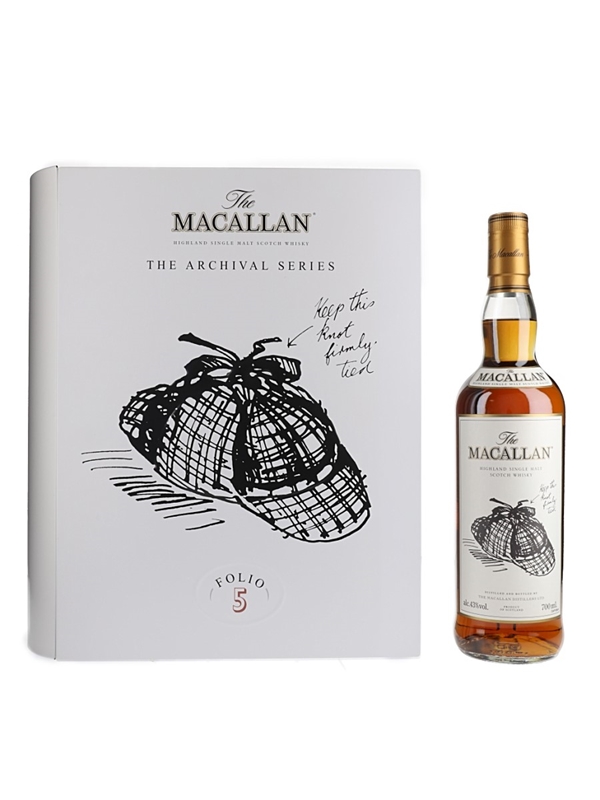 A bottle of The Macallan The Archival Series Folio Five Highland Single Malt Scotch Whisky. This is the fifth chapter in The Archival Series, sold with a commemorative book all within a book-shaped presentation box.