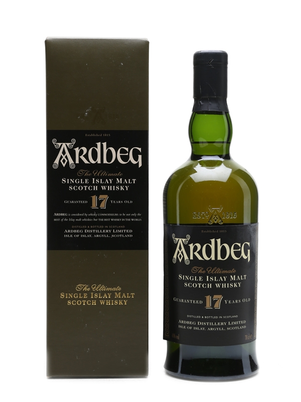 A bottle of the Ardbeg 17 Year Old which was bottled between 1997 and 2004. The first bottling of this hard-to-find whisky helped establish Ardbeg's reputation after the Glenmorangie takeover.