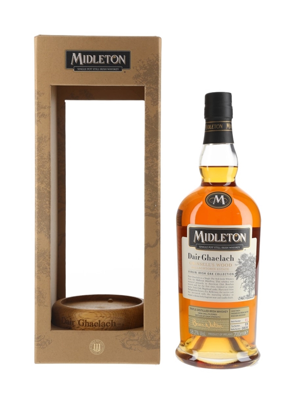 A bottle of Midleton Dair Ghaelach Single Pot-Still Irish Whiskey. This was matured for between 15-22 years in American oak bourbon barrels, finished in virgin Irish oak hogsheads and bottled at 58.2% ABV.