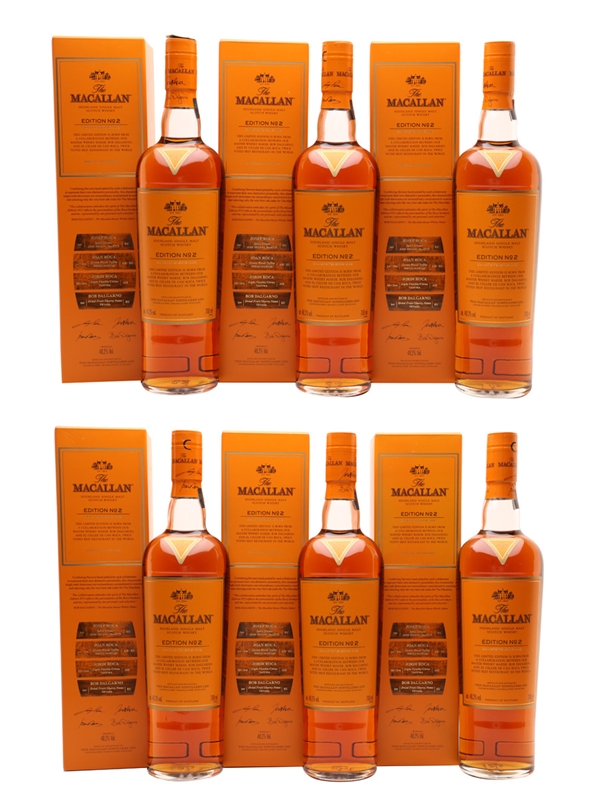 This lot contains six bottles of The Macallan Edition No.2 Highland Single Malt Scotch Whisky. This is a limited edition matured in four distinct cask types selected by master blender Bob Dalgarno and Spanish chefs Joan, Josep and Jordi Roca from El Celler de Can Roca. The restaurant was twice voted best restaurant in the world.