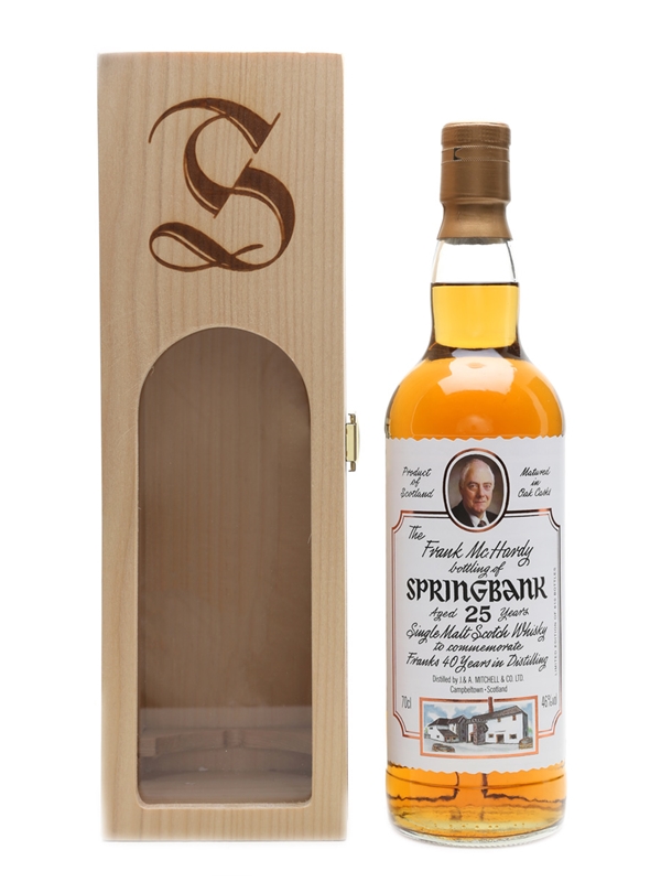 A bottle of Springbank 25 Year Old released to commemorate Frank McHardy's 40 years in distilling. This is presented in a wooden case and each bottle was numbered and signed by Mr McHardy himself.