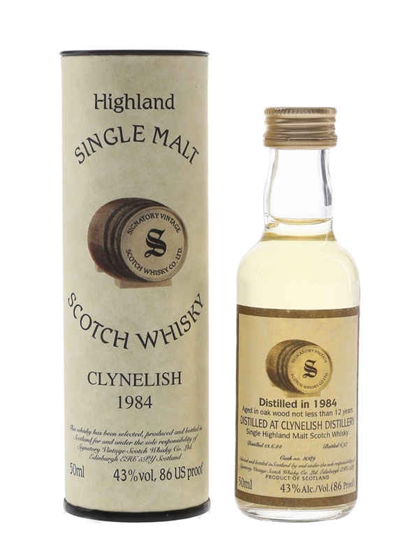 A miniature bottle of Clynelish 12 Year Old Single Highland Malt Scotch Whisky. This was distilled on 13 June 1984, matured in oak wood and bottled in June 1997 by Signatory Vintage.