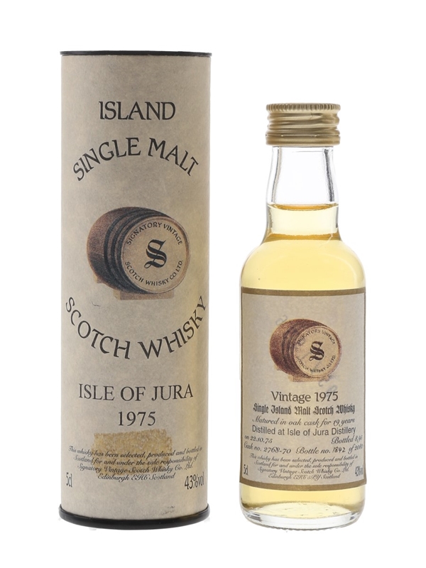 A miniature bottle of Isle of Jura 19 Year Old Single Island Malt Scotch Whisky. This was distilled on 22 October 1975, matured in a oak cask and bottled in August 1995 by Signatory Vintage.