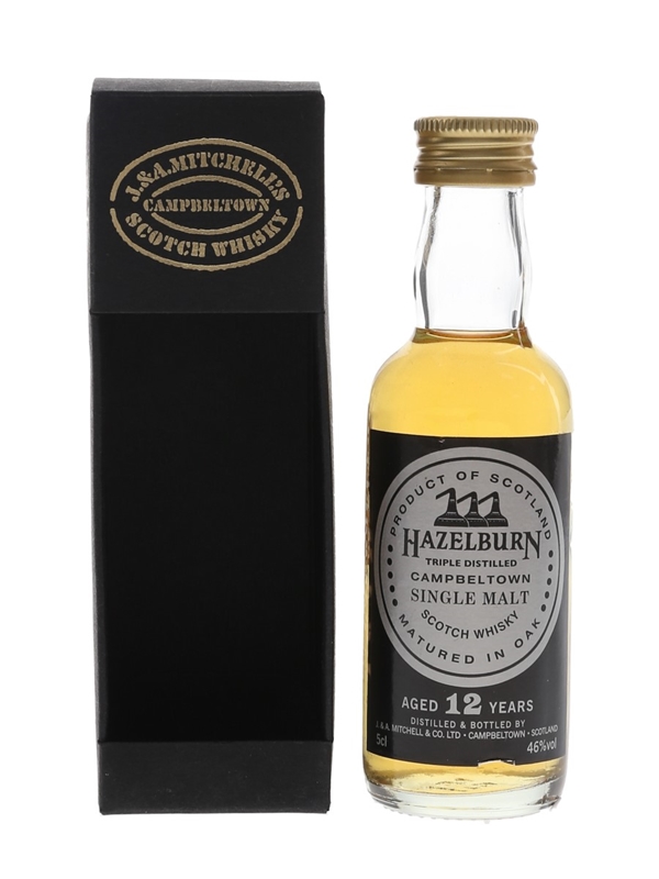 A miniature bottle of Hazelburn 12 Year Old Campbeltown Single Malt Scotch Whisky, a triple distilled, unpeated single malt from Springbank distillery.