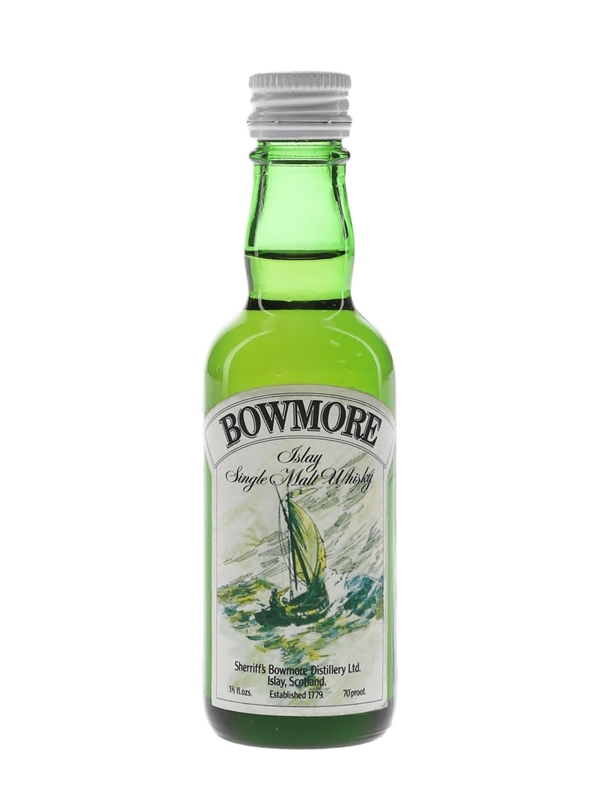 A miniature bottle of Bowmore Islay Single Malt Whisky bottled by Sherriff's Bowmore Distillery Ltd., we estimate in the 1970s.
