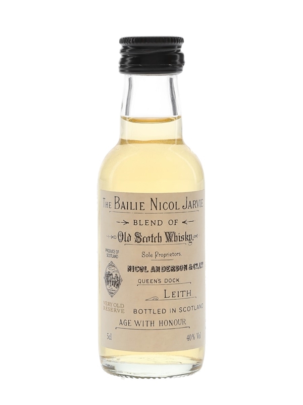 A miniature bottle of Bailie Nicol Jarvie Blen of Old Scotch Whisky. This bottling was discontinued by Glenmorangie in 2014.