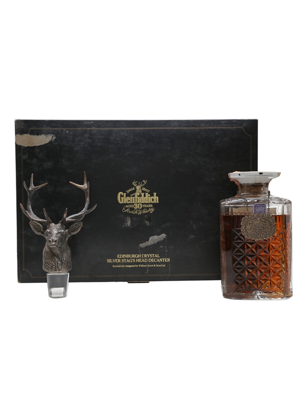 A very rare crystal decanter of Glenfiddich 30 Year Old with a solid-silver stag's head stopper.