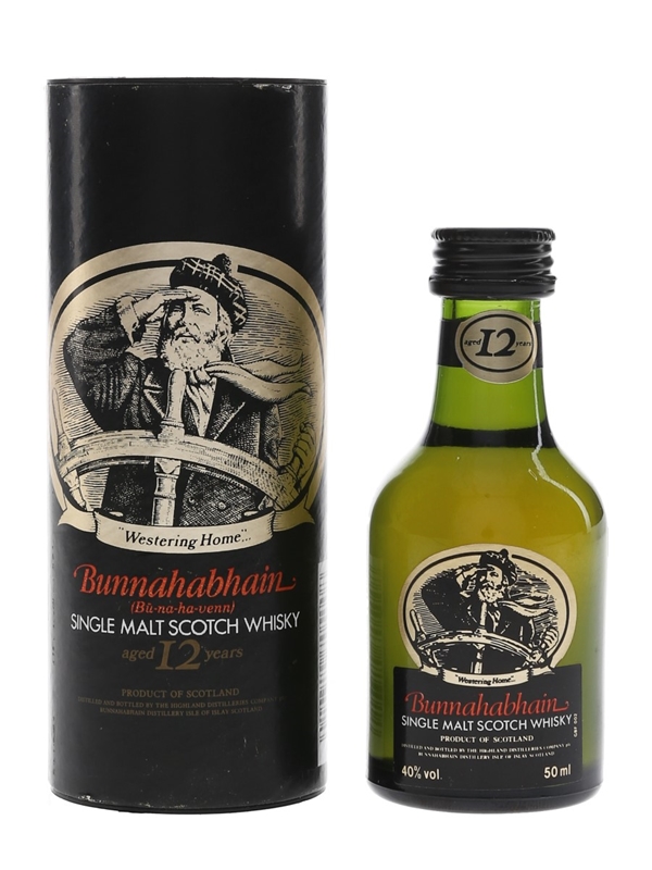 A miniature bottle of Bunnahabhain 12 Year Old Single Malt Scotch Whisky. We estimate this was bottled in the 1980s to 1990s.