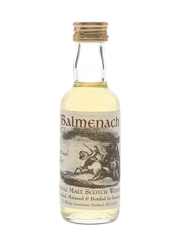 A miniature bottle of Balmenach 1977 Single Malt Scotch Whisky, bottled by The Whisky Connoisseur.