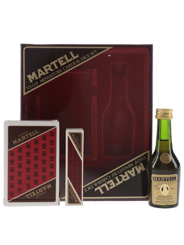 A miniature bottle of Martell Medaillon VSOP Cognac in a presentation box. This comes with a pack of playing cards and poker dices.
