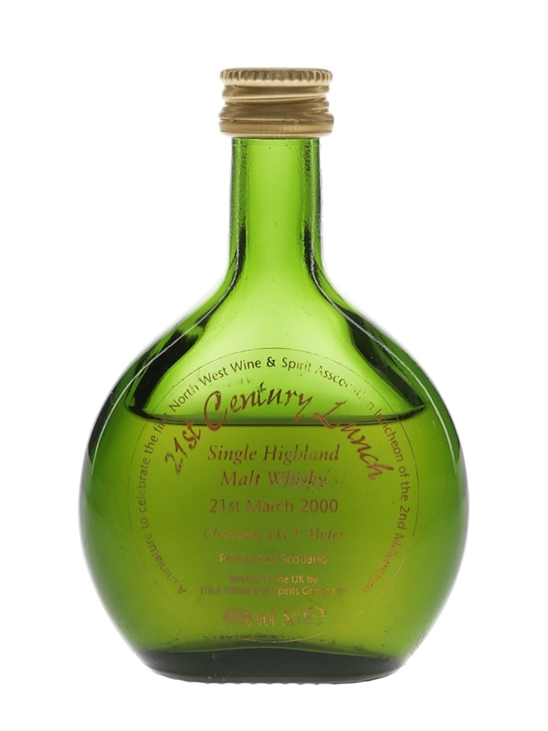 A miniature bottle of Single Highland Malt Whisky, bottled to commemorate the first North West Wine & Spirit Association luncheon of the second Millennium on 21 March 2000.