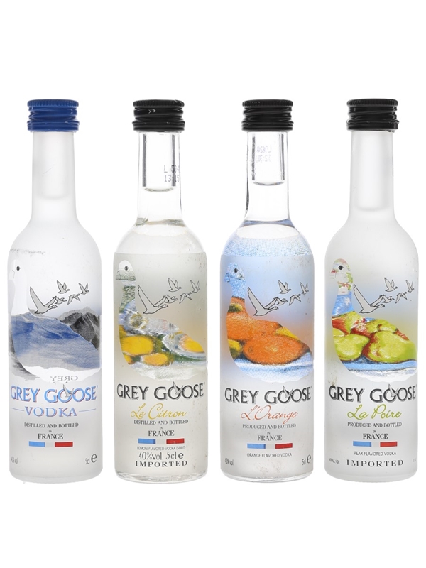 This lot contains four miniature bottles of Grey Goose Vodka, flavours include: Le Citron, La Poire and L'Orange.