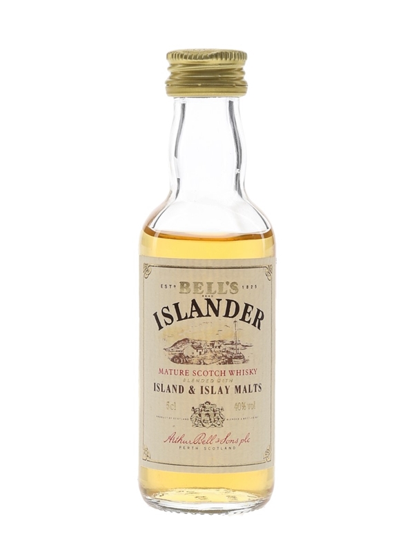 A miniature bottle of Bell's Islander Mature Scotch Whisky. This is a blend made mostly from Islay and Island malts. We estimate this was bottled in the 1980s.