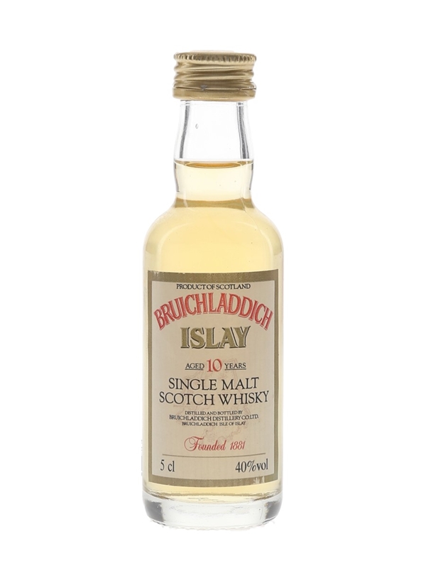 A miniature bottle of Bruichladdich 10 Year Old Single Malt Scotch Whisky. We estimate this was bottled in the 1980s.