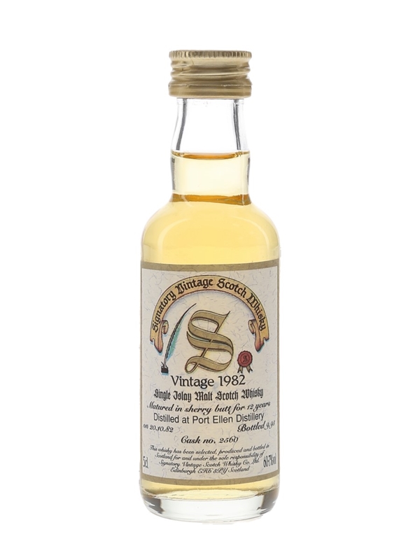A miniature bottle of Port Ellen 12 Year Old Single Islay Malt Scotch Whisky. This was distilled on 20 October 1982, matured in a single sherry butt and bottled in September 1995 by Signatory Vintage.