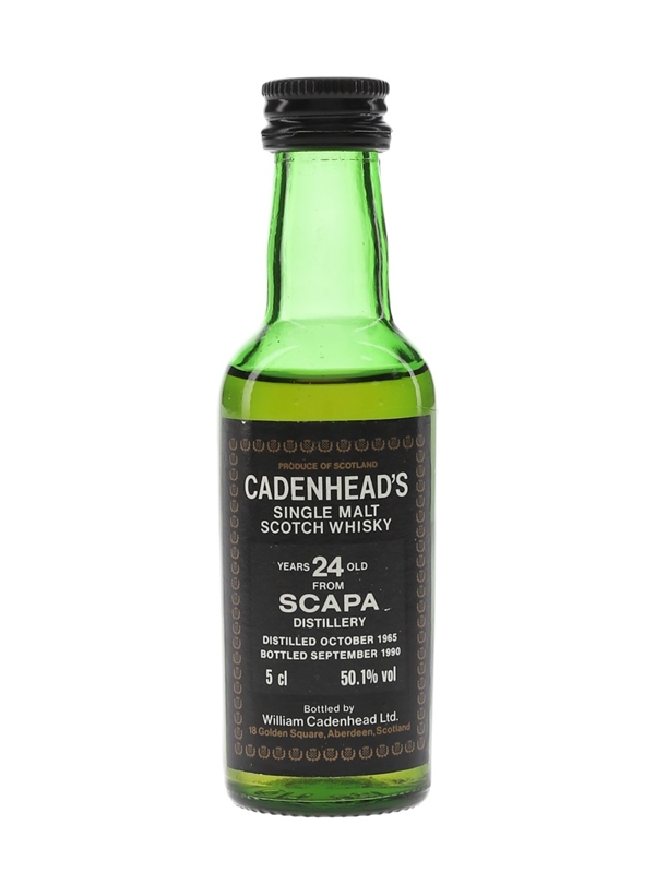 A miniature bottle of Scapa 24 Year Old Single Malt Scotch Whisky. This was distilled on October 1965, and bottled at 50.1% ABV in September 1990 by Cadenhead's.