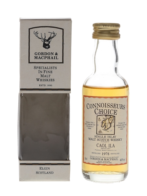 A miniature bottle of Caol Ila 1978 Single Islay Malt Scotch Whisky. This was distilled in 1978 and bottled by Gordon & MacPhail as part of the Connoisseurs Choice series. The bottling code indicates this was bottled in 1991.